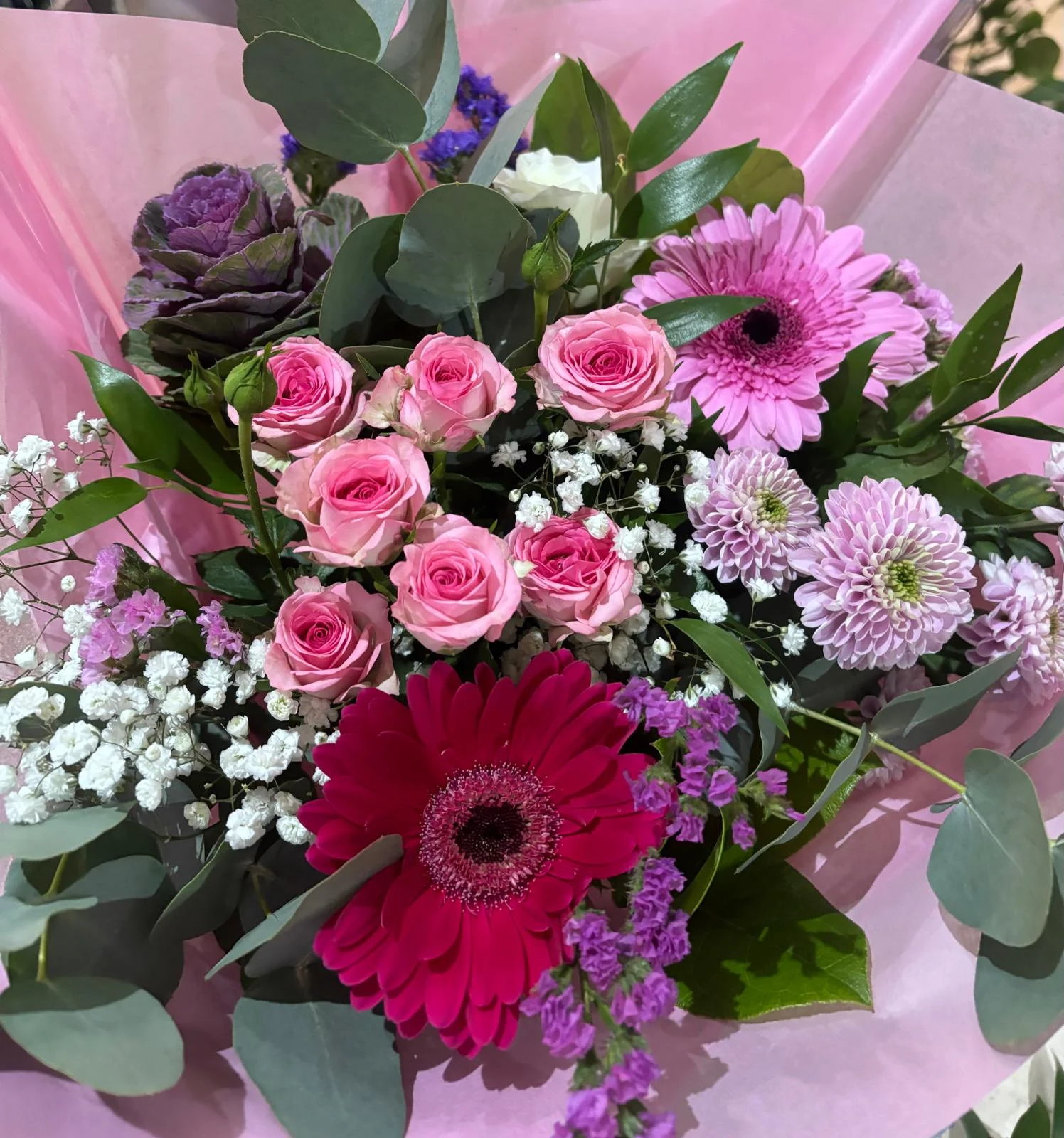 Including Roses, Gerbera, Brasica, with silver Grevillea foliage.